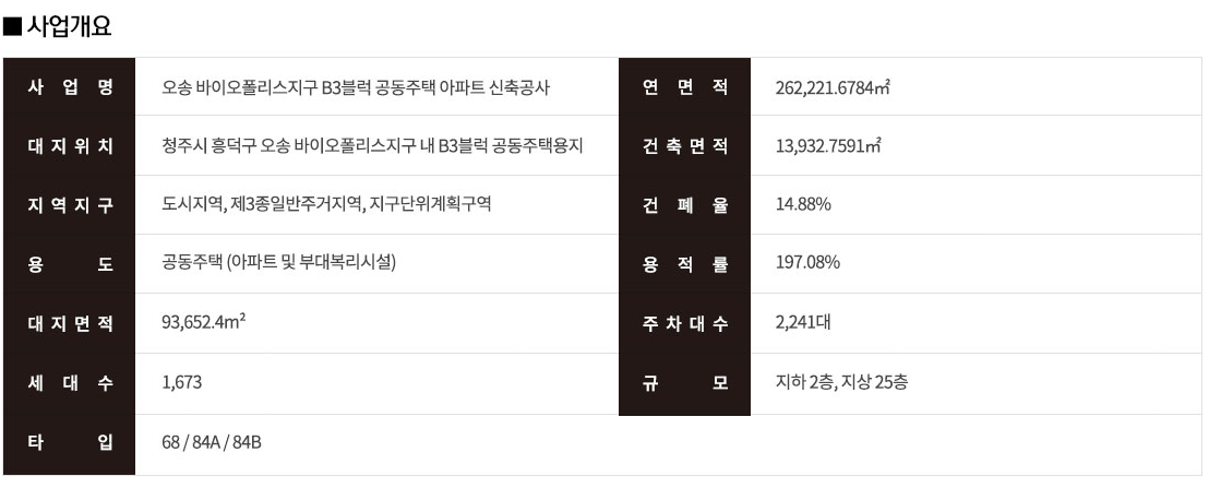청주시 흥덕구 오송바이오폴리스지구 b3블럭. 지하 2층지상 25층 14개 동 ③ 전용면적.